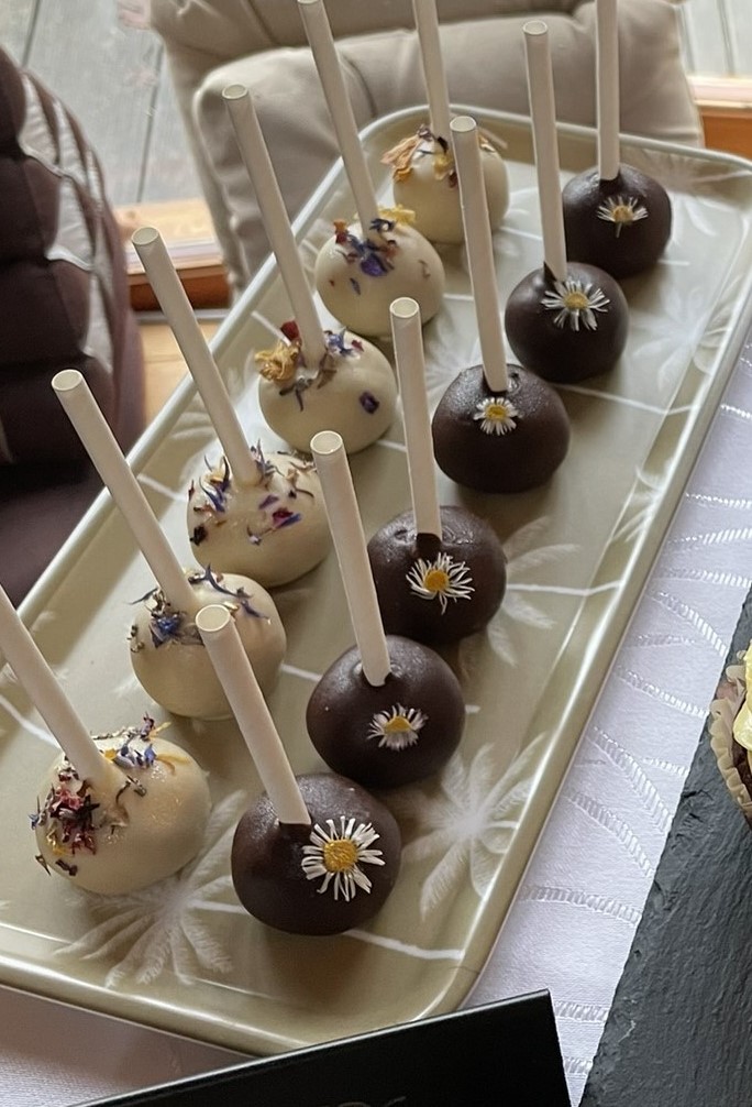 dortová lízátka - dortový korpus z rýžové mouky, čokoládová ganache z kokosové smetany, marmeláda, (rum), namočené v čokoládě, zdobení