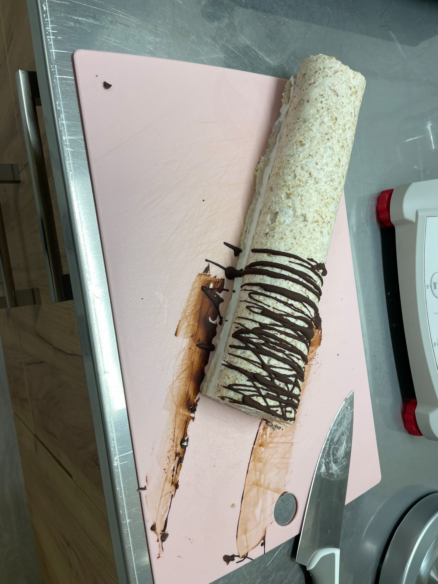 - roláda s jahodovou marmeládou, kokosovou šlehačkou a čokoládou 55,00 Kč