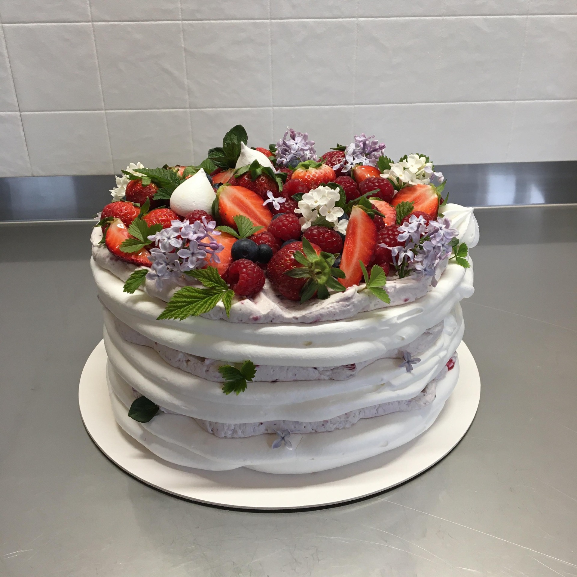 Pavlova dort složený se tří korpusů, smetanového krému a ovoce. Zdobený ovocem a květinami.