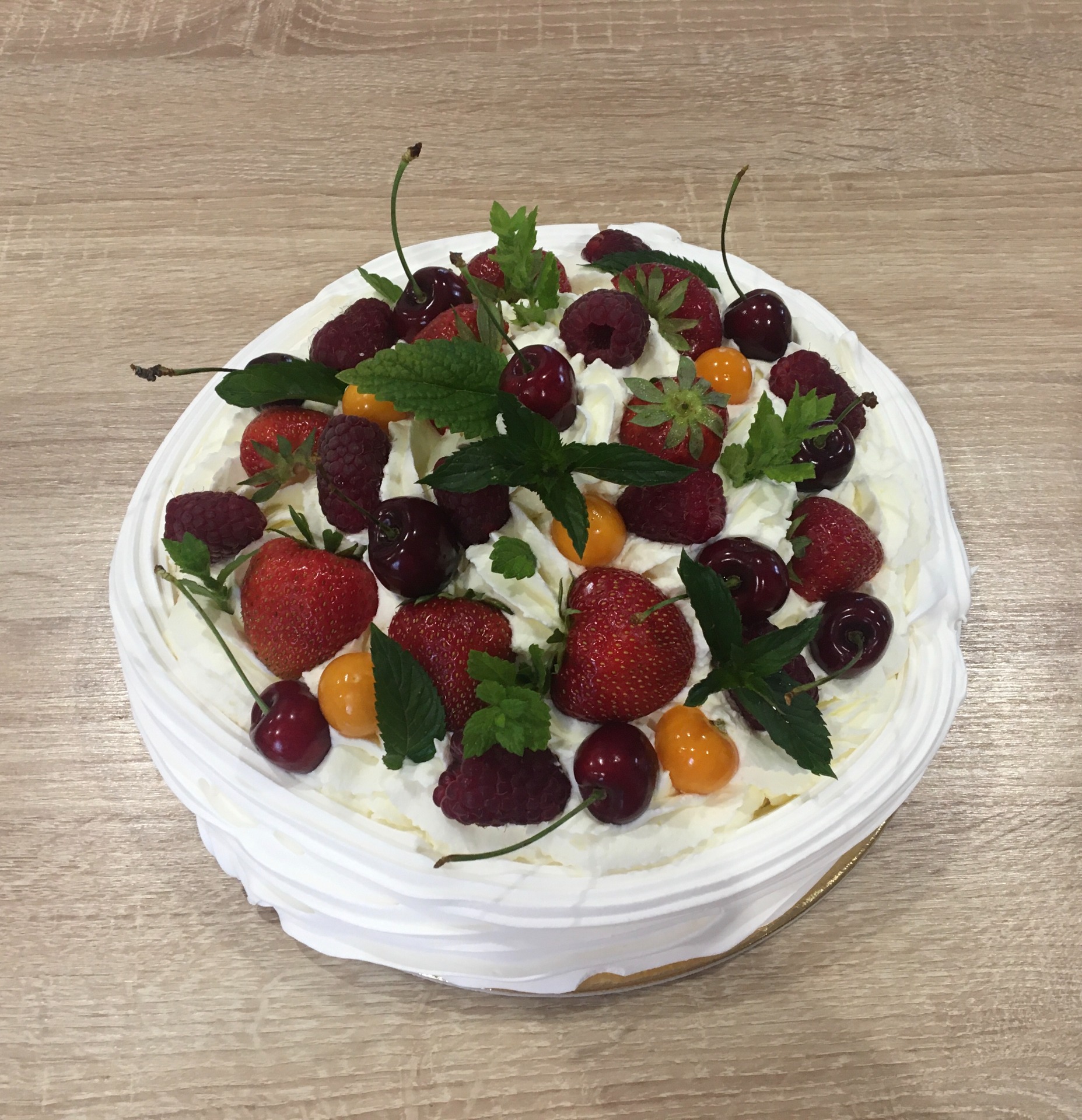 Pavlova korpus o velikosti 24cm s vanilkovým krémem, čerstvým ovocem a květy nebo bylinkami dle sezóny 750Kč